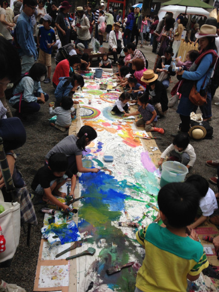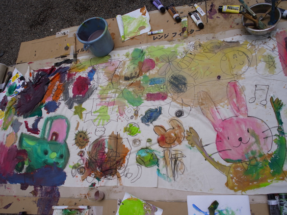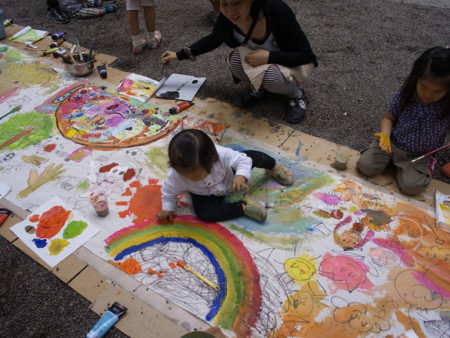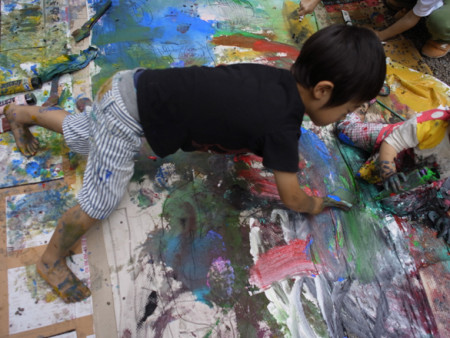 その子のお父さんが「こうやって手に絵の具を塗ってペッタンすると楽しいよ〜」と、