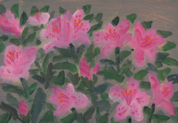 井の頭通りで西日を浴びて輝くツツジの花を描きました。