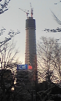 新東京タワー“スカイツリー”が7分咲きの桜の花のむこうで