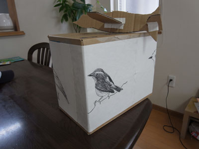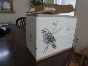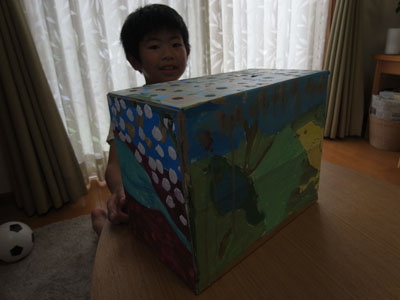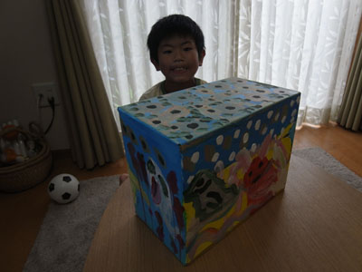 ヒマだったので 群馬に住む妹の家に行き 4年生になった甥っ子とワークショップ ボクの仕事の描き損じの絵を段ボール箱に貼って 貼って