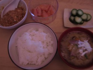 米の飯と豚汁、納豆とぬか漬けのキュウリ