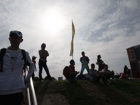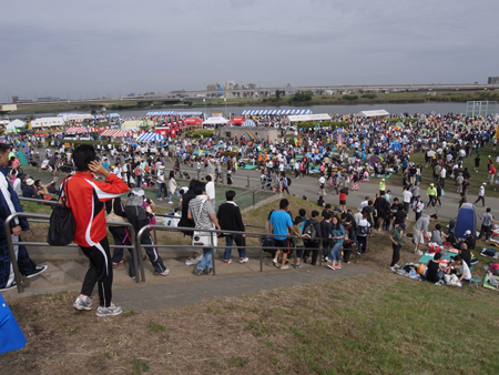 北千住の駅からスタート地点の荒川河川敷まで人、人、人