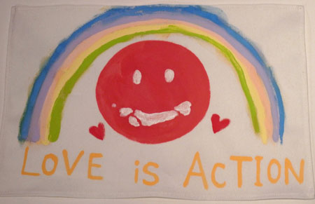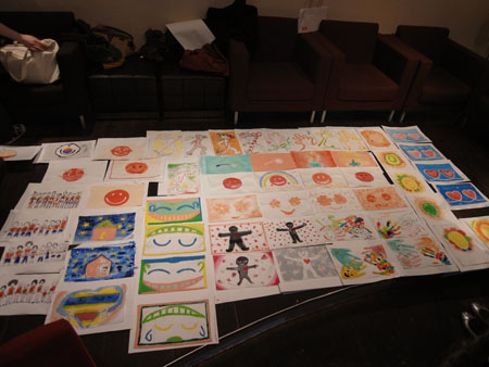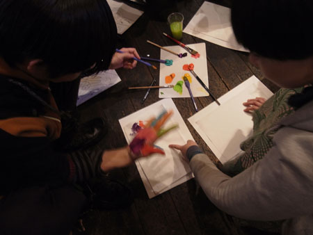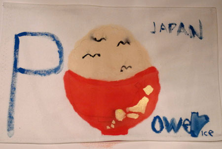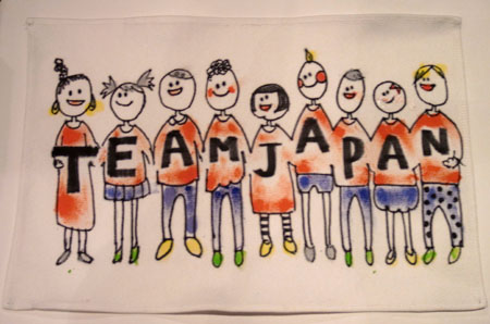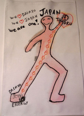 大名の街から被災地を勇気づける元気な旗を作る作業