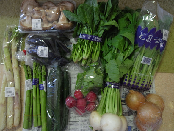 カブ、ラディッシュ、アスパラガス、オクラ、トマト、小松菜。