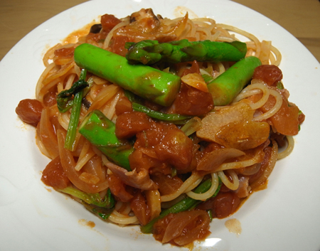 フライパンの中でチャッチャとトマトソースらしきものをこしらえて