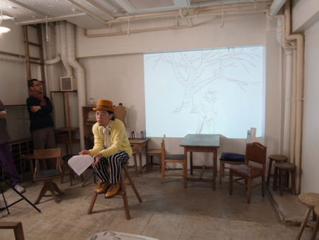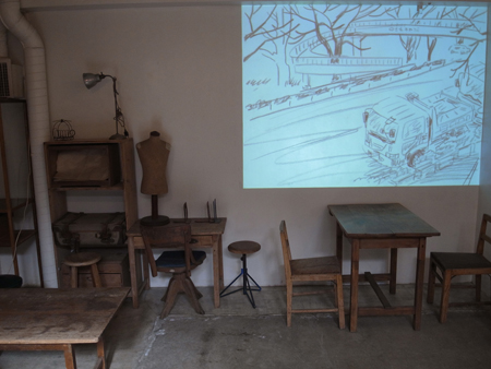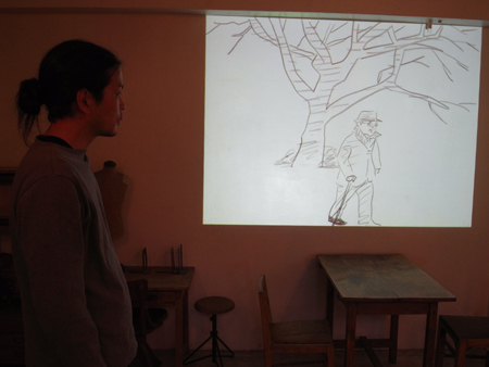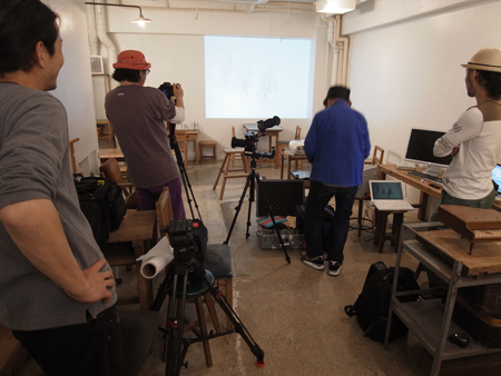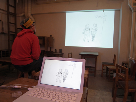 撮影の背景で流れるボクのドローイングの映像に対して