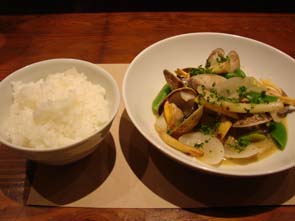 (ウドやゴボウやエンドウがアサリと一緒に蒸されてました)