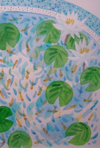 睡蓮の水鉢の中で爆発的に育ったメダカ。
